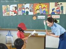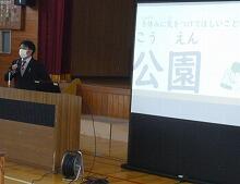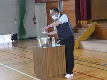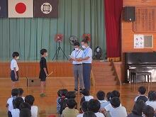 体育館に避難を完了した後、スクールサポーターの黒田さんから「お・は・し・も・ち」や「いか・の・お・す・し」の合い言葉について詳しいお話を聞きました。特に、登下校時に不審者から身を守るためのお話では、6年生の谷聡二郎君が不審者に捕まえられそうになったときの対処の仕方を演じました。堂々としていたので、みんなのよいお手本になりました。