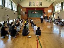 9月7日(水)5校時に不審者対応の避難訓練を実施しました。今回は、体育館で4年生のみんなが体育の学習をしているときに、不審者が侵入したという想定です。延岡警察署スクールサポーターの黒田さんに「不審者」の役をしていただきました。児童も職員も緊張はしていましたが、速やかに動くことができました。