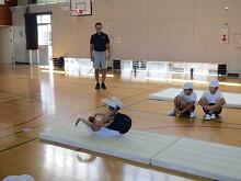 檜室先生(体育振興指導教員)によるマット運動の指導