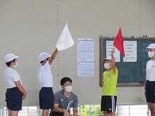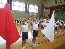 団長を務める6年生2名が、箱から出ている赤白旗を引き抜き、団の色が決定しました。