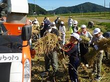 今日は子ども達が一人一人鎌を持って刈り取りをした後で、コンバインで残りを刈り取りました。