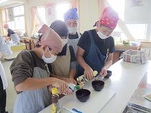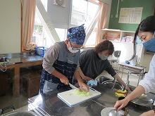 ゆであがった野菜は、ボールの中の水に浸して素早く冷やします。こうすると、野菜の色も鮮やかなまま、歯ごたえも残るということでした。5年生のみんなは、野菜をゆでたり、包丁で野菜を切ったりすることが非常に手慣れた様子でした。