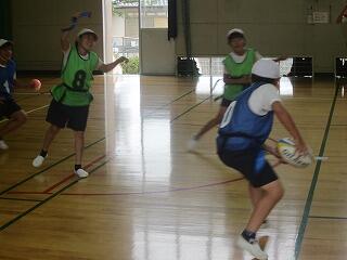 『4年生は体育でタグラグビー。ワンチームだ!タグとったどー!』
