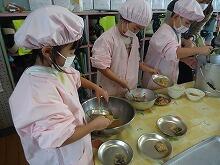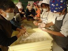 つきあがったもちは、みんなで丸めていきます。つきあがったばかりのおもちは熱いので、もちをちぎる作業は保護者や地域の方にお願いしました。最初はなかなか丸くできませんでしたが、繰り返すうちにだんだんと形よくできるようになってきました。