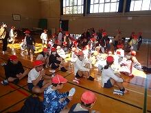6年生の姿を見ると、カナリヤ園のお友達は大きな声であいさつしてきます。なんて愛らしいのでしょう。そんなお友達が、6年生の前にお利口さんで座って、園長先生や6年生代表の有田太陽さんのお話をしっかり聞いています。感心、感心。