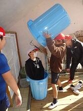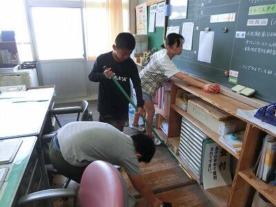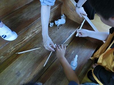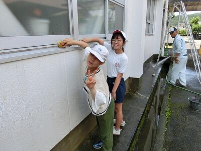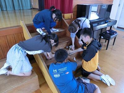 グループに分かれて、職員室や玄関、体育館など、自分たちで決めたところを一生懸命に掃除しました。割り箸など身の回りの物を清掃用具として上手に使ったり、中城先生に高圧洗浄機で手伝ったりしてもらいながら、2時間、集中して作業し、いろいろな所がピカピカになりました。