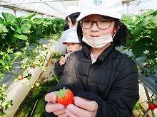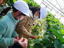 (それぞれ3人)いちごの苗がよく育つように葉を起こしたり、実を減らしたりする。