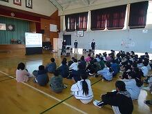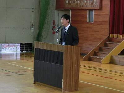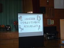 校長先生が3つの話をされました。横断歩道で止まってくれた車にしっかりと礼をしているお友達がたくさんいること、6年生のみんなが地域の方々へ表現集会への招待チラシを作ってくれたこと、あいさつは相手の目をしっかりと見て行うとよいことの3つです。