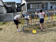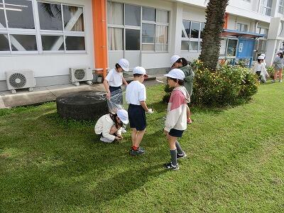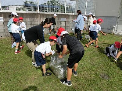 後半の美化作業では、中城先生が刈っておいた運動場の草をみんなで集めました。どの子も一生懸命に作業して、草の入ったビニール袋がいっぱいになりました。すっきりきれいになった運動場でたくさん運動したり、遊んだりできますね。みんなよくがんばりました!