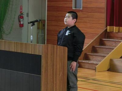 終業式で作文を発表したのでは、2年生の加藤 寿丸(じゅまる)さんでした。寿丸さんは、2学期にできるようになったこととして、「跳び箱5段」「あやとび12回」「字をていねいに書くこと」「早おき」の4つをあげていました。できるようになりたいという気持ちを大切にしてがんばってきたということでした。