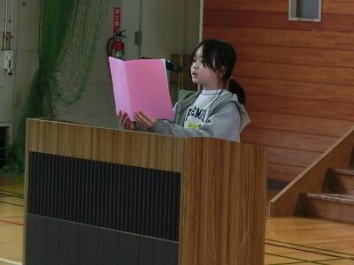 児童代表作文発表では5年生の渡部みのりさんが上級生としての自覚をもって下級生のお手本になりながら、委員会活動やあいさつ、算数の学習をがんばりたいことをしっかりと述べることができました。