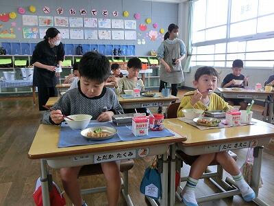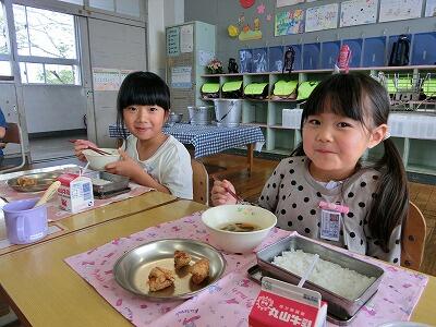 ストローの差し方などを、岩切先生より教わった後、みんなで元気に「いただきます。」をしました。小学校での初めての給食には、みんなの大好きな唐揚げが出てきました。スープのタケノコや唐揚げにそえてあるブロッコリーなど、お肉もお野菜もみんなおいしそうに元気に食べていました。保育園や幼稚園よりも量が増えて、ちょっぴり食べるのが大変そうなお友達もいましたが、きっとこれから食べる量も増えていくでしょうね。さあ、これからどんなメニューが登場するかな? 楽しみだね。