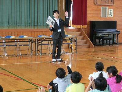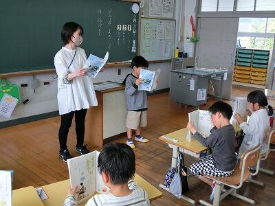 1・2年生のお友達に、お話しのおもしろさを伝えようと、延岡市立図書館司書の上村さん、橋口さんが川島小学校にいらっしゃいました。