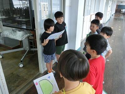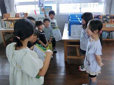 1年生はグループで学校のいろんな場所を回りました。それぞれの場所で説明してくれたのは2年生のみんなです。2年生はその場所の説明に加えて、〇✕クイズを出したり、1年生のカードにスタンプを押したりするなど、1年生のみんなが楽しく学校たんけんができるよう、お兄ちゃん、お姉ちゃんらしく工夫してくれました。説明も分かりやすくてとても上手でした。きっと1年生もどこにどんな場所があるのか、よく分かったと思います。