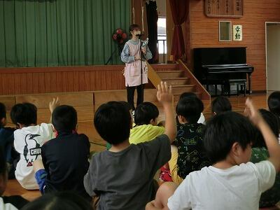 さらに、5月の生活目標「給食のきまりやマナーを覚えよう」について、保健給食委員会のみんなが、食べている時の様子を演じてくれたり、給食着のたたみ方を実演してくれたりしました。全校のみんなに正しい食べ方や上手なたたみ方が分かりやすく伝わりました。