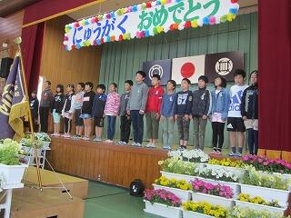 『ウォークラリーを終えて、優勝班の代表6年生にヒョーショージョーが渡されました。バンザーイ!』