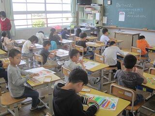 『2年生の教室をのぞいてみると、読書感想画の彩色に取り組んでいました。みんな中々の力作でしたよ。』