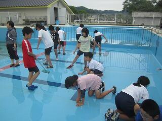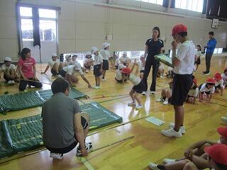 『3・4年生の団技はサーフボードで波乗りを表現した競技でした。中々バランスをとるのが難しいようです。』