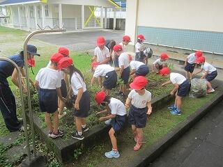 学校ではこれからの季節、秋を題材にした学習が多くなりますが、そんな中、1年生が夏の間に育て、観察してきたアサガオのつるを使ってリースづくりをしていました。