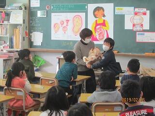 授業の後半を再度見に行くと、赤ちゃんの人形を抱っこして、実際の体重を感じる体験を行っていました。