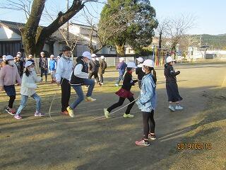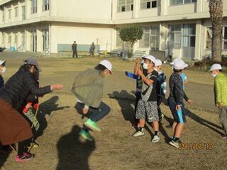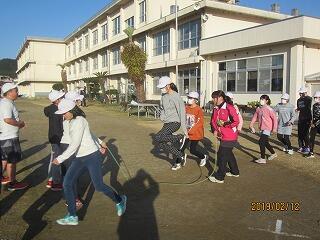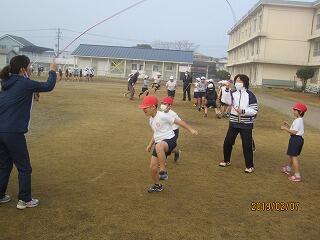 『1年生、寒い中体育服で張り切ってます。頑張って跳んで、今日の記録会で新記録102回を出しました。ヤッター!』
