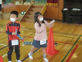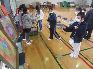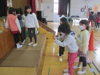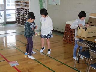 2年生が保護者の方にも手伝っていただいて作っていたおもちゃを使って、今日の2校時体育館で1年生とおもちゃまつりを行いました。