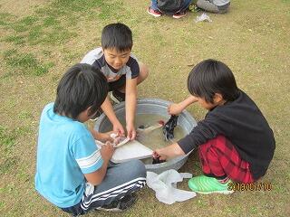『やば!自分たちの班の水が一番汚れているよ。いいと、いいと。それだけ汚れが落ちたっていうことだから!そう!僕たちみたいに心もきれいにお洗濯!』