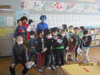 『赤鬼さん、青鬼さんが突然入って来たために泣いてしまった子どももいた1年生。泣きながらも鬼は外!と、豆を投げつけていました。最後は仲良く写真撮影です。』