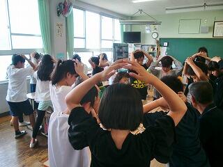『3年生の教室でも音楽に合わせた仲間づくりゲームで盛り上がっていました。』