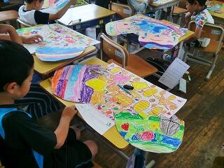 『3校時、2年生の教室では図工【ひみつのたまご】の作品が完成していました。どの作品も色鮮やかに仕上がっていました。』