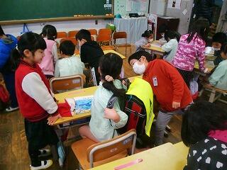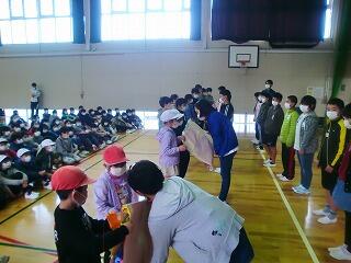 今日はお別れ遠足でしたが、まず最初に体育館でお別れ集会をしました。4・5年生の運営委員会が中心となって企画し、6年生とゲームで交流したりメッセージをおくったりしました。