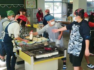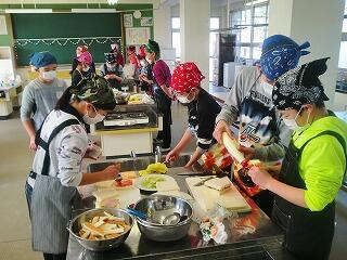 3・4校時の家庭科調理実習で会食メニューを作り、5校時の茶話会に備えました。