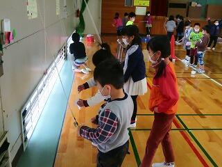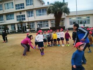 今朝は先週できなかった大なわ跳びの体育集会でした。昨日までの冷え込みも今朝はあまり感じられず、運動場の状態も良かったです。