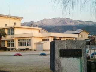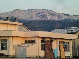 今朝、正門から後方の山を見ると、山の中腹まで雪で真っ白