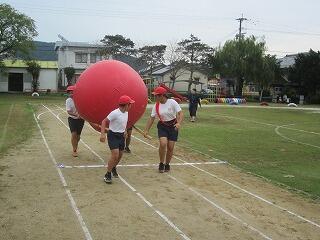 『1・2年生の団技は大玉を転がしています。自分たちより大きな大玉ですが、上手に転がしていました。』