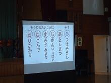 続いて、清掃担当の米良先生から、3月の生活目標「心をこめてそうじをしよう」についてお話がありました。川島小学校には、そうじの合い言葉として、「とむすじあ」というものがあります。と(とりかかり)、む(無言)、す(すみずみ)、じ(時間いっぱい)、あ(後始末)を意識してそうじをするということです。米良先生は、3月の目標を達成するために、この合い言葉に「み」を付け加えました。「み」は、「みつけそうじ」ということだそうです。そうじが終わったと油断していてはいけません。そうじをするところは無限にあるのです。それを自ら進んで見つけてきれいにする、それこそが心をこめてそうじをするための極意です。