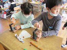 友達のおもちゃも気になりながら、いろんな工夫をしながら材料をくっつけたり、切ったりしていきます。さてさて、どんな楽しいおもちゃができるのでしょうか。おもちゃ祭りが楽しみです。