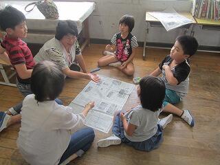 『2年生は新聞紙を使った陣取り?ゲーム。グループごとにゲームを楽しんでいました。』