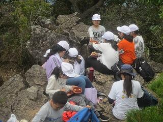 『全員頂上に無事到着でーす。みんなでお弁当を食べるところです。』