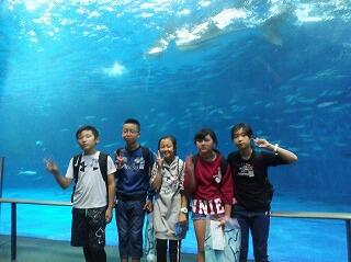 『大水槽の前で班別写真を撮りました。ハイチーズ。ジンベエ君が写ってますか?』