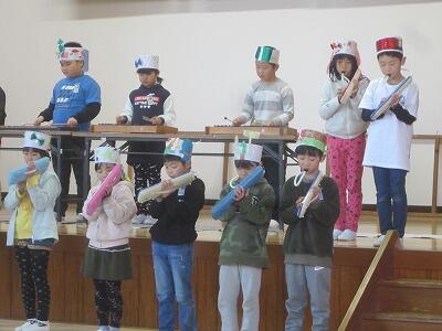 『最後の合奏でピシャリ。今回もすばらしい表現集会でした。手作りの帽子がとてもカワイイ2年生。ラーメンマン?違います!』