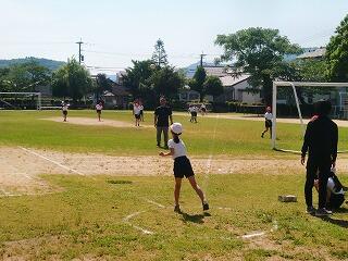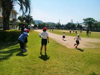 『ソフトボール投げ。投げ出す角度に気をつけて。エイ!!』