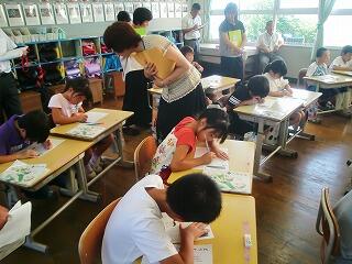 『1年生は算数。5校時で蒸し暑い中、合わせていくつになるか考えていました。』
