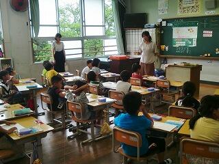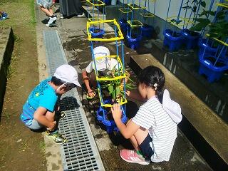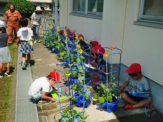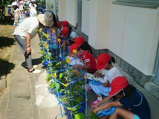 1年生はアサガオの観察をしていましたが、どの子どもたちも大きなアサガオの花が咲いていました。また、2年生はミニトマトやオクラ、ナス、ピーマンといった種類の作物を観察していました。食べ頃までにはもう少しでした。