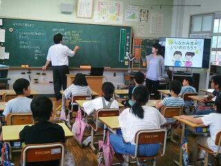 今日は3年生の教室で算数の模範授業を行いました。これは初任者の先生や、先週から本校に来ている教育実習生に向けた授業でした。