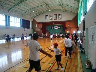 1・2年生は体育館で体育。運動会で踊る『ばんばおどり』を保護者の方々にも教えていただきながら頑張って練習しました。