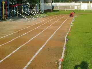 『雨で土が流れ、かなりデコボコだった直線コースもご覧のとおり。体育主任も感謝のあまりひざまずいています。え、ポイントを打っているだけ?失礼しました。』