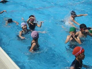 『小プールでは1・2年生が楽しく水遊びです。ジャンケン列車で仲間づくりです。』