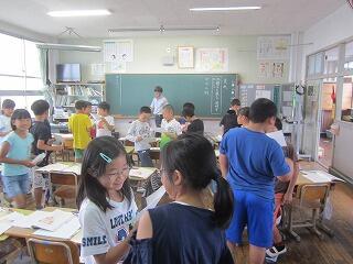 今日は港小学校との交流学習です。時間的には3時間目から昼休みの時間までと限られてはいましたが、一緒にプールや教室で学習したり昼休みは一緒に遊んだりとお互いに楽しく交流することできました。特設の時間だけではなく、日常の学校生活や行事等でも交流が図られるとよいですね。