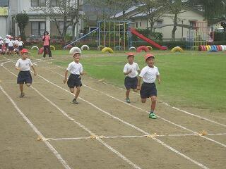 『2時間目、1・2年生がまずは徒競走を行っていました。この記録をもとに団分けをします。まっすぐ走ってね。』